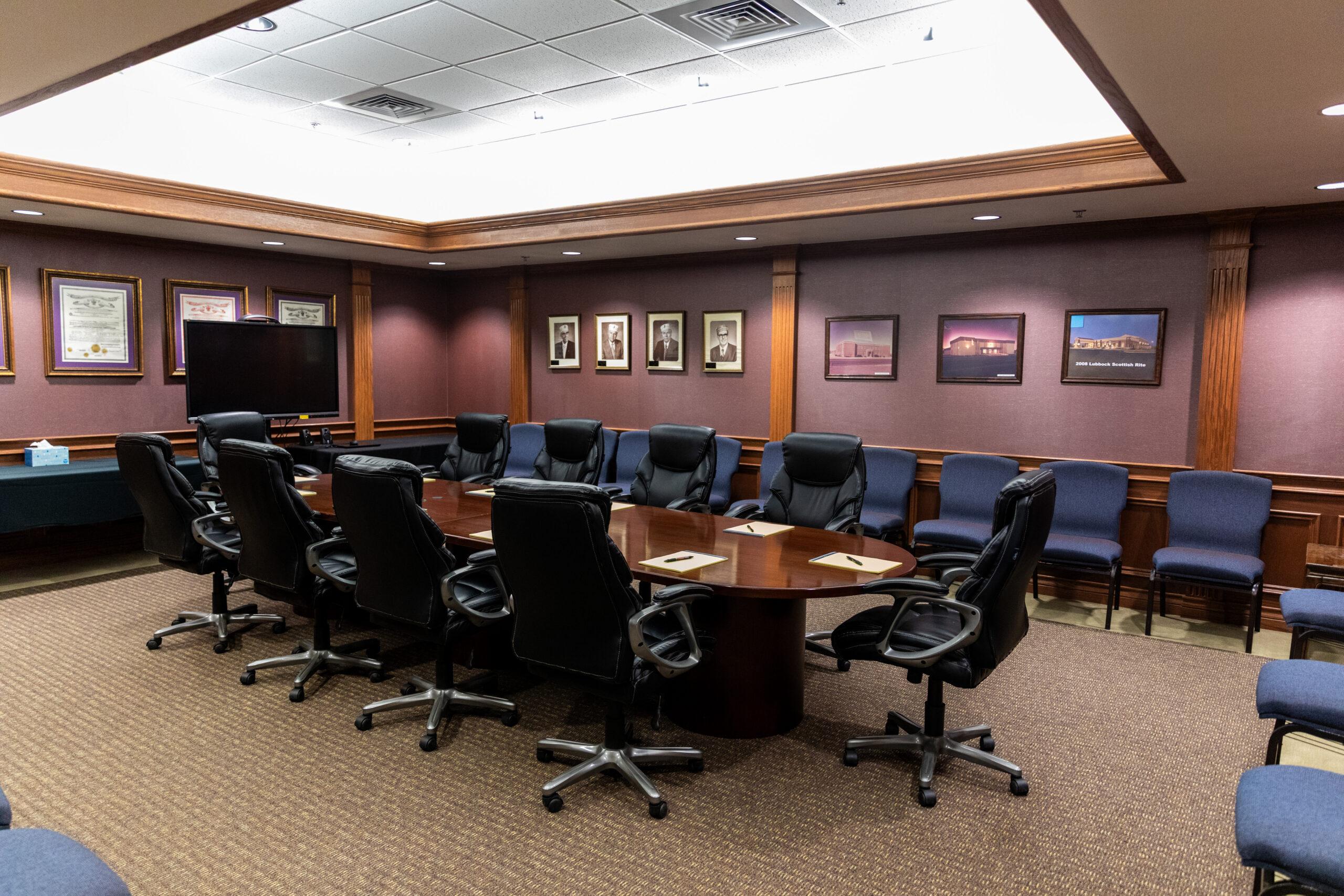 Conference room with seating for 10 around the table and additional seating around the room for up to 20 more and includes a/v.